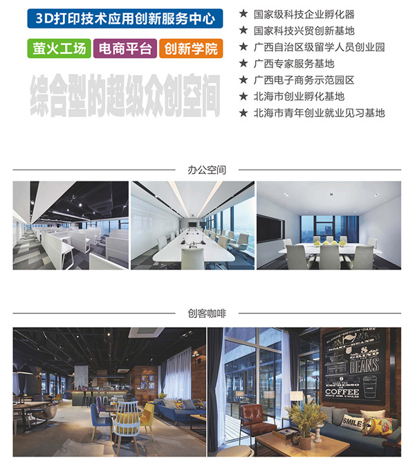 中電北海產(chǎn)業(yè)園眾創(chuàng)空間規(guī)劃面積5000平方米,重點圍繞智慧城市、智能硬件、物聯(lián)網(wǎng)、移動互聯(lián)網(wǎng)、大數(shù)據(jù)、電子商務等重點新型產(chǎn)業(yè)領(lǐng)域,采取互聯(lián)網(wǎng)+現(xiàn)場服務的模式,整合上下游資源,為入住企業(yè)和創(chuàng)業(yè)者提供政策咨詢、科研支持、人才引進、電商培訓、創(chuàng)業(yè)指導、融資對接等服務,形成支持創(chuàng)新創(chuàng)業(yè)的生態(tài)圈。中電北海產(chǎn)業(yè)園眾創(chuàng)空間通過整合各方資源,已經(jīng)集成一批面向區(qū)域主導產(chǎn)業(yè)的前沿技術(shù),整合了戰(zhàn)略投資基金、天使基金和社會投資相結(jié)合的創(chuàng)新創(chuàng)業(yè)投資基金,建立了涵蓋科學家、創(chuàng)業(yè)企業(yè)家和企業(yè)運營管理專家的創(chuàng)業(yè)導師團隊,聚集電商平臺、3D打印技術(shù)應用創(chuàng)新服務中心、創(chuàng)新學院、螢火工場實驗室等一體化服務機構(gòu)構(gòu)成綜合型的超級眾創(chuàng)空間。